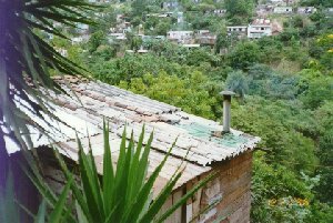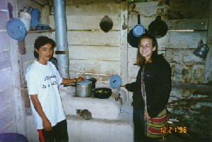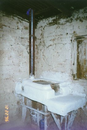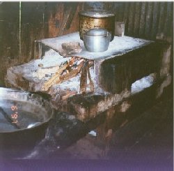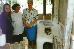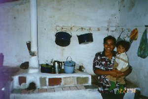 | Old "traditional" stove, semi-open with no chimney | Plancha Stove: Promoted and built by Prolena in Honduras. Observe the draft control at the chimney and also a round metal door, on the left side of the stove, that is used to remove dirt from the chimney. This stove costs about $25 US. Observe the darkness of the ceiling, this is due to the use of a stove with out a chimney before the improved stove was installed. |