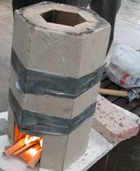 | Modular stove segments were cut and cast | permitting rapid prototyping like a rocket chamber built to the stack dimensions of Prasad (1991) | or fit with a skirt to accept a pot |