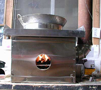 with Baldwin sheet metal skirt around partially submerged pot. Dead air space helps to isolate thermal mass from the fire. 29% efficient. This simple Rocket stove was fabricated and developed with help from Damon Ogle and Jim Wilmes, students at a Aprovecho stove class, beginning June 10, 2002. |