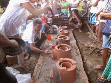The system uses the same oven bottom, and two different covers, one for wood and one for charcoal. Both ovens can bake high quality Bingka rice cakes, but with two different levels of particulate emissions. (Notice the soot on the wood fired oven). However, both ovens are cleaner than the hornohan stove that Eco-Kalan would like to replace.