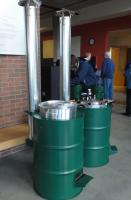 The institutional version of the StoveTec Stove for use in schools and other organizations, has an attached chimney and an a pressure cooker version. The pressure cooker is useful to shorten cooking times, and the fuel consumption, when cooking beans and small grains.